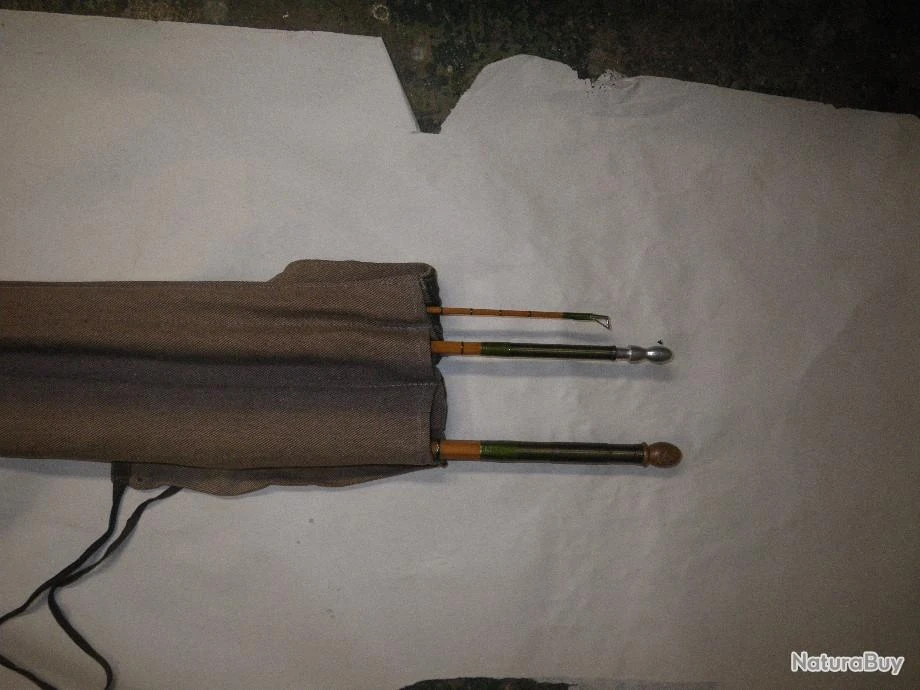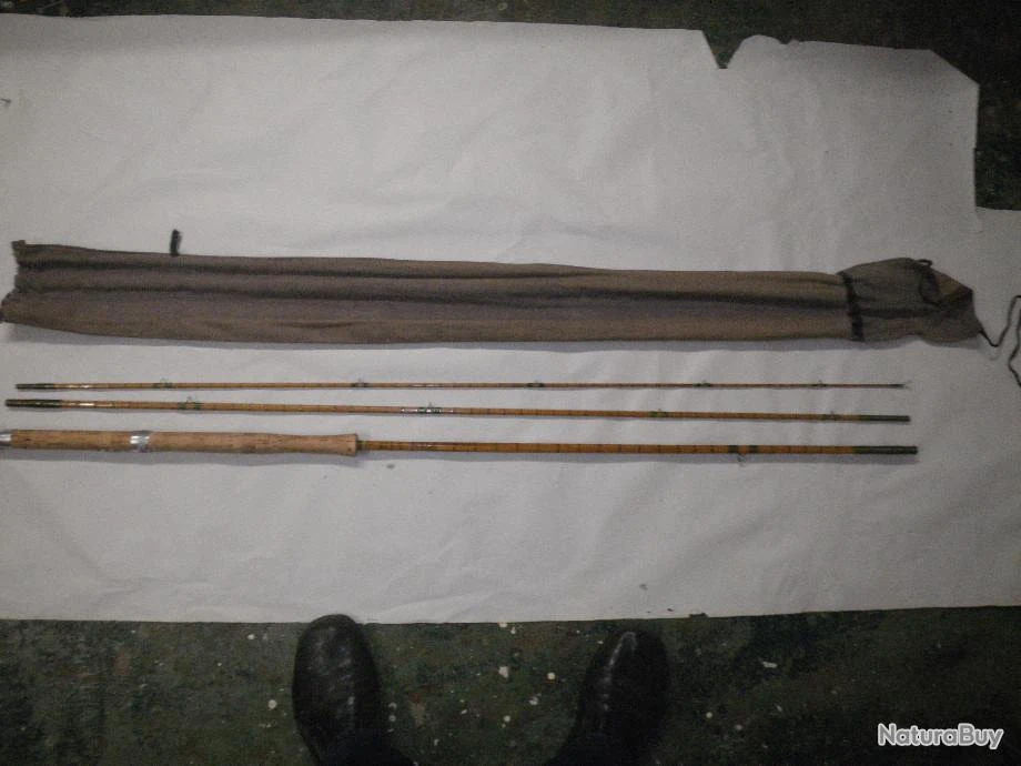 Canne ancienne en bambou refendu (ayant appartenu à Alain Escriva pour info) acquise au cours d’une vente aux enchères à Elbeuf au début des années 2000. Canne pour la truite en trois brins de 11.6 pieds en parfait état très bien conservée avec ses identifications d’origine et ses protctions d’enmanchements en maillechort toutes les ligatures et anneaux intacts.