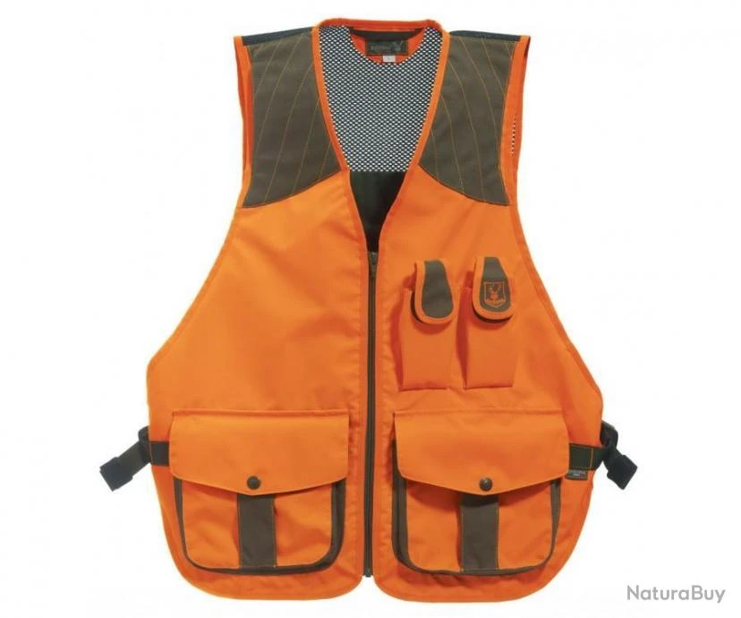 Gilet de chasse orange haute visibilité avec détails en microfibre marron, léger et avec tissu intérieur respirant.