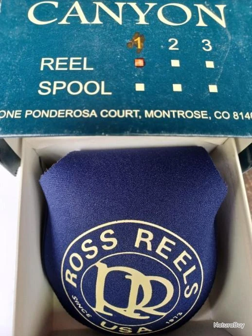 Vds moulinet ROSS CANYON n°1 MADE IN USA. Noir anodisé. Alu usiné (pas coulé). Large arbor. 130 g. Manivelle bois précieux. Frein micrométrique hyper souple à très puissant. Réversible droitier-gaucher. Pochette néoprène bleue et boîte au logo Ross Réels USA. Idéal pour soie 00 à 3. Jamais servi. Ai acheté son grand frère Ross Evolution plus adapté pour mes soies 4 à 5.